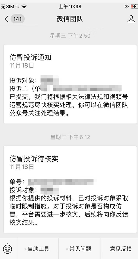 您好,6月24号日投诉了一个视频号仿冒身份,我们有营业执照和同名公众号登陆页面证明(公众号名称:金地集团),但是对应的视频号昵称被他占用。我们投诉了仿冒身份后,微信那边采取了临时限制措施,但是一直没有得到反馈,投诉单号:8202106240513842720 麻烦问下什么时候可以得到最终结果反馈?谢谢