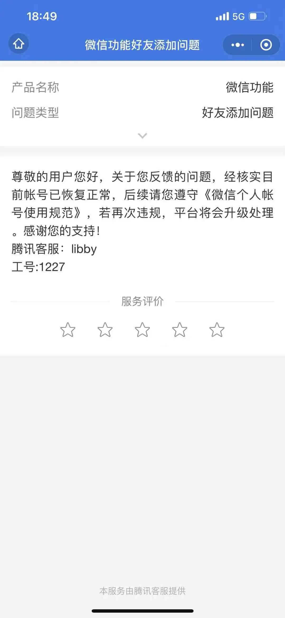 别人无法添加我为好友。有时候可以添加,有时候又不行。添加不了的时候,提示我的账号违反了微信个人账号使用规范,无法添加好友。但是我去微信安全中心查看,我的账号被没有任何异常,可以看下方截图。我去腾讯客服提交问题,得到的回复都是我的帐号是正常的。但是我的账号在实际使用过程中,别人确实是有的时候无法添加我为好友。有人知道是怎么回事吗?