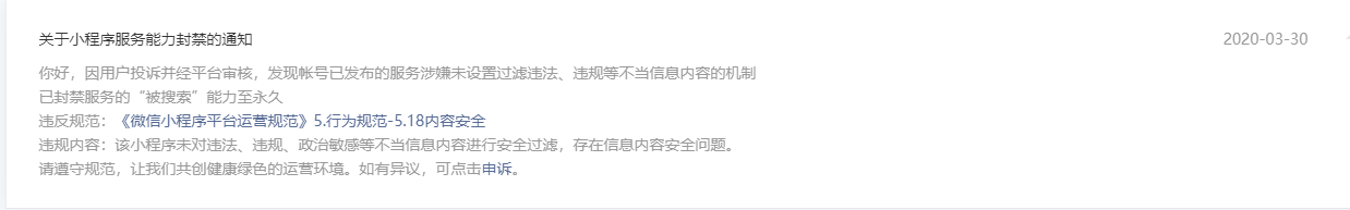 你好,经核实,你的帐号(可上传违规敏感图片制作相册)确实存在涉嫌未设置过滤违法、违规等不当信息内容的机制,请自觉遵守国家相关法律法规,不从事违法或违反《微信小程序平台运营规范》及相关规则的内容和行为,谢谢。