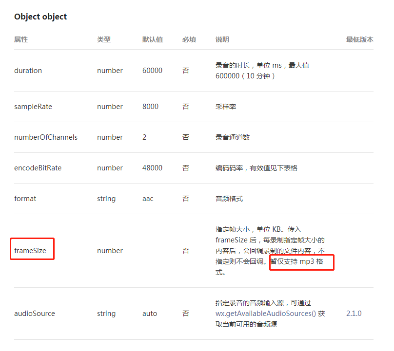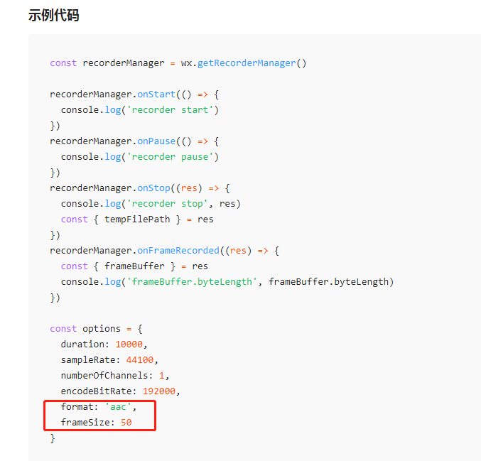大哥,我得意思是,RecorderManager文档中属性frameSize描述为暂仅支持mp3格式,而文档下方得示例代码中,转手传的两个属性:音频格式:aac,framSize:50