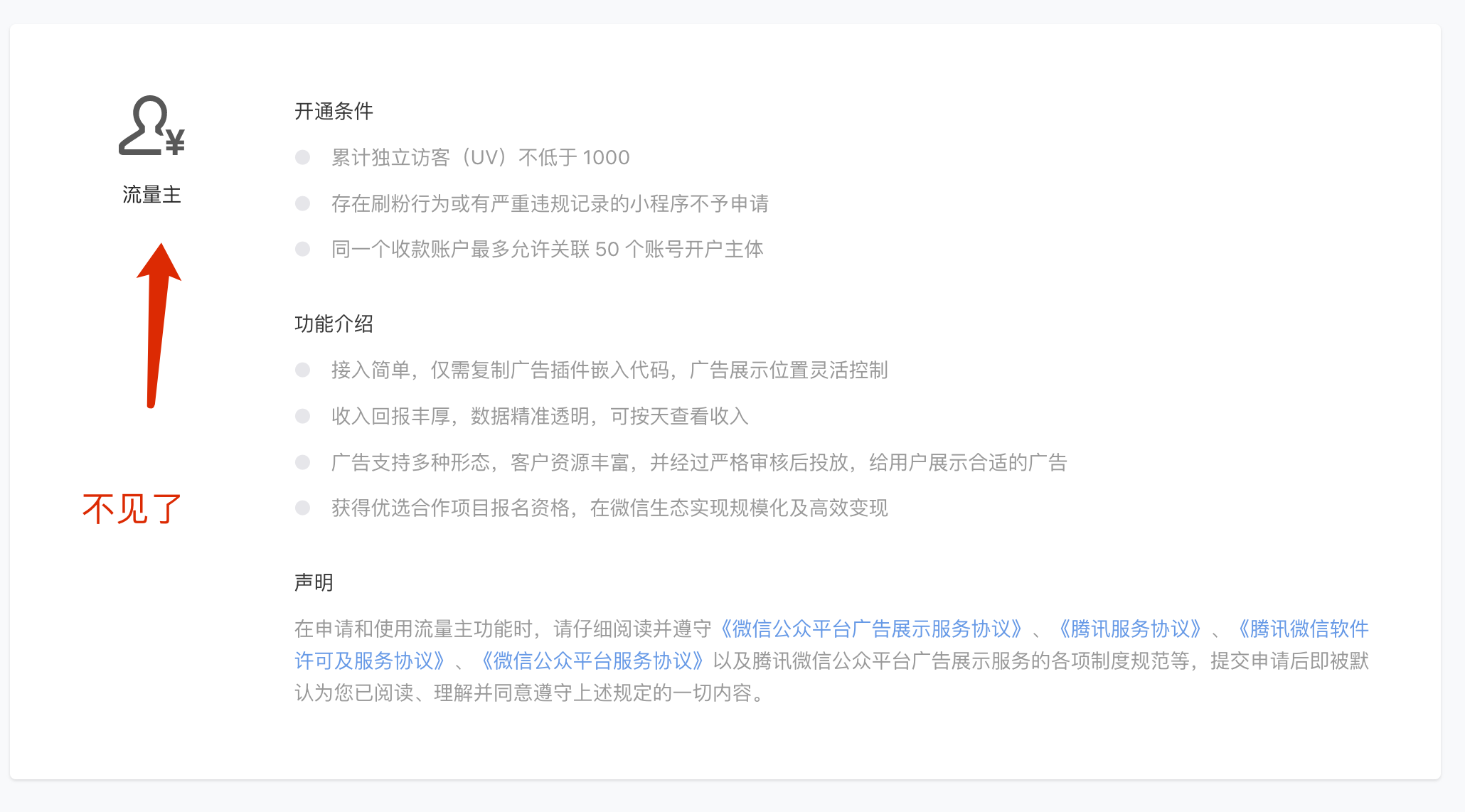 微信小程序后台开通流量主显示【系统错误】后,然后再次进入开通流量主页面,开通按钮不见了。小程序appid(wxa6b946fe45551d5f)