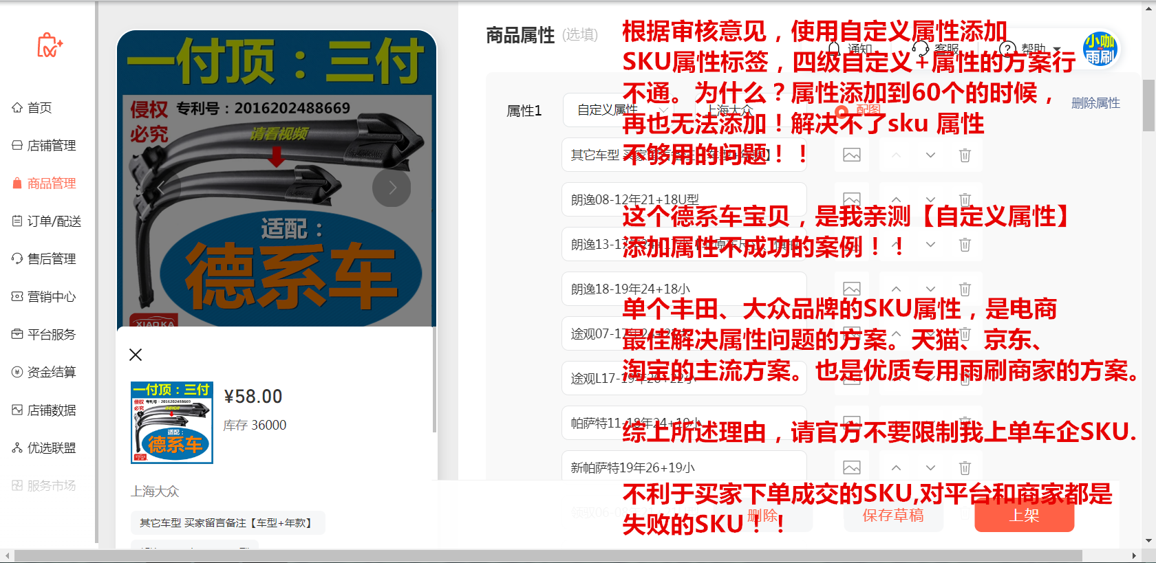 日产审核通过的宝贝,编辑删除一张图片,又审核不通过,要允许上架的宝贝修改重新上架!!!!!!!!正常上架的宝贝全部不通过!!!当下春季雨季,是汽车雨刷销售旺季,平台不让我正常上架宝贝销售,我卖啥货!!!!!!!!!赶紧取消电脑审核,帮我改人工审核@@@@@@@@猪一样的平台宝贝审核员,猪一样的队友!!!!!拜托啦,急急急!!!!!!!!!!!!!!!!!!!!!!!!!!!!