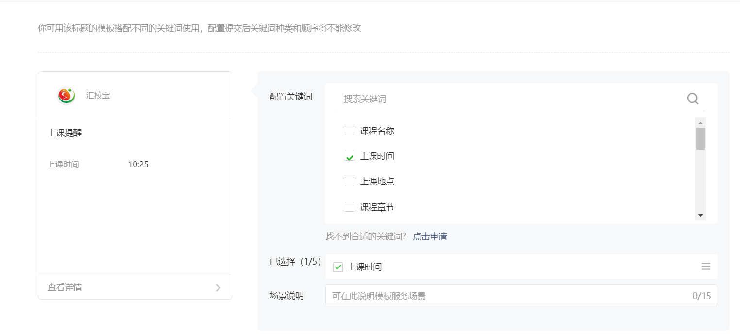 我需要的是上课时间,例如 星期一 10:25 ,但是关键字会重名,不知道审核会不会通过,而且我想打小程序的客服电话咨询,然而电话都没有@官方给个解释