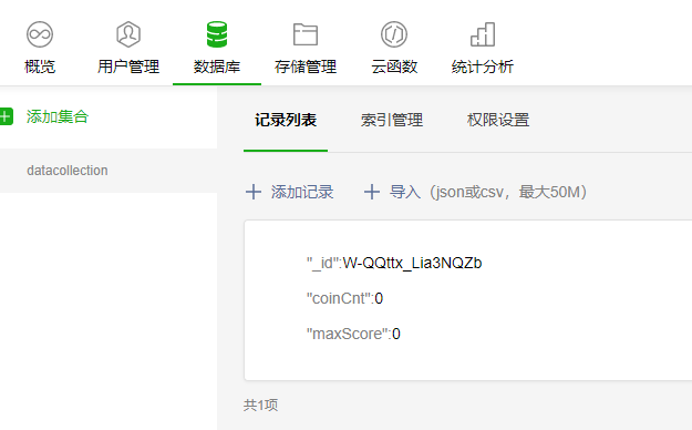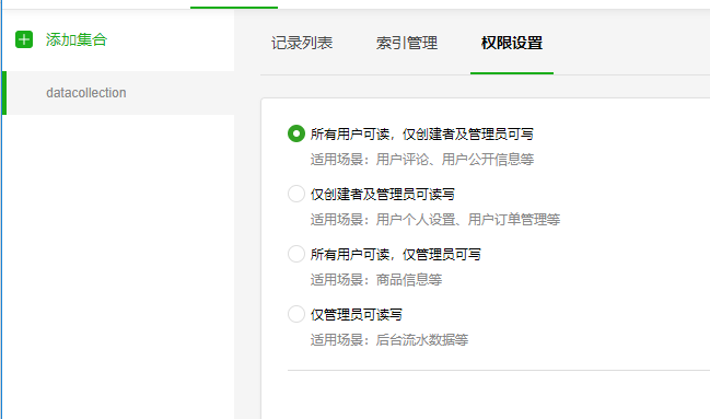 1,在数据库添加字段 加_openid 写你自己的openid 这样权限才认为你创建者 你这个没有_openid 是没有创建者的 小程序端是修改不了的