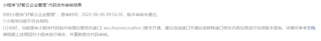 小程序审核不通过的原因是wx.chooseLocation接口未开通: