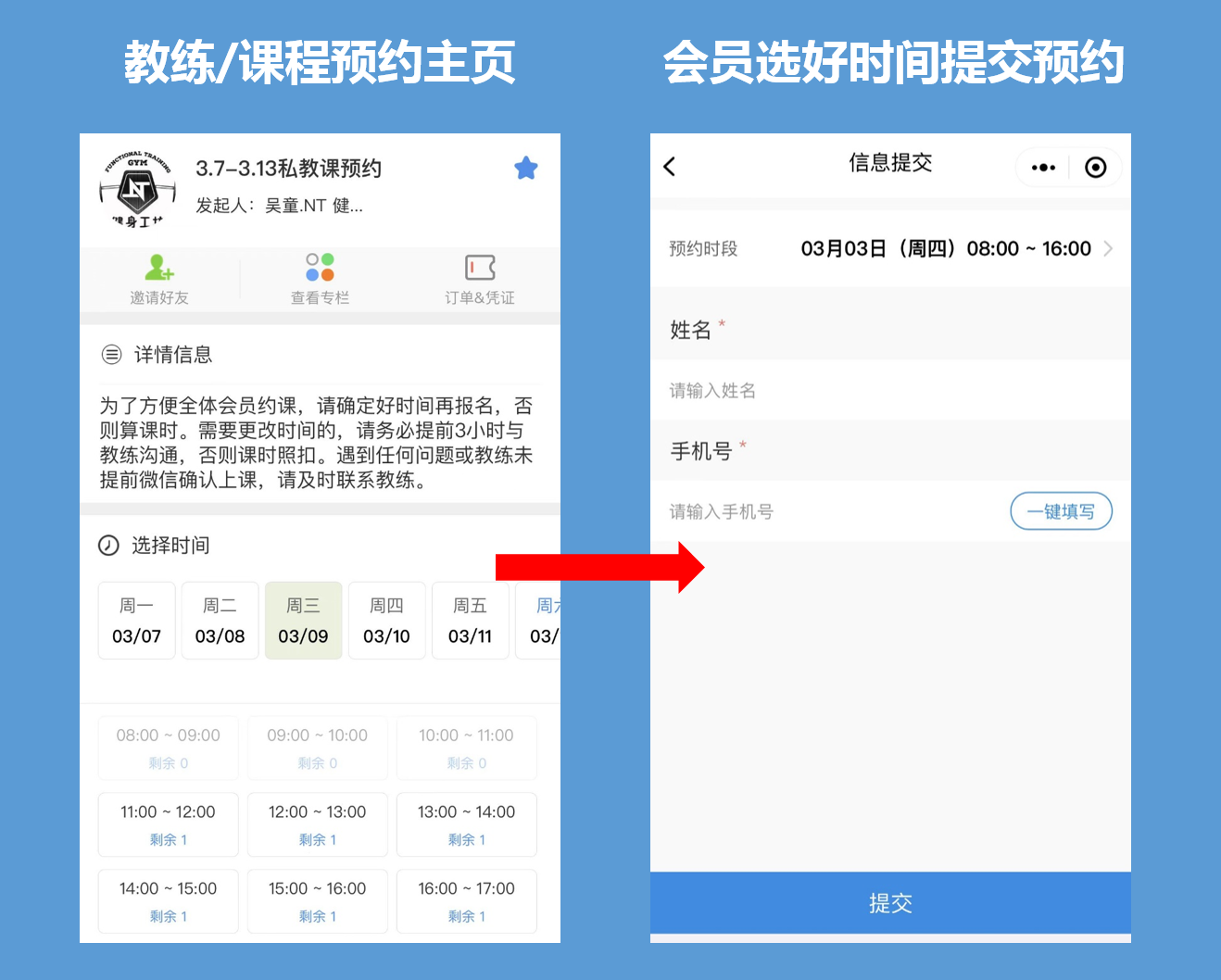 ① 学员可以在教练课程预约主页中选择需要上课的时间,填写好相关信息后就可以提交完成预约: