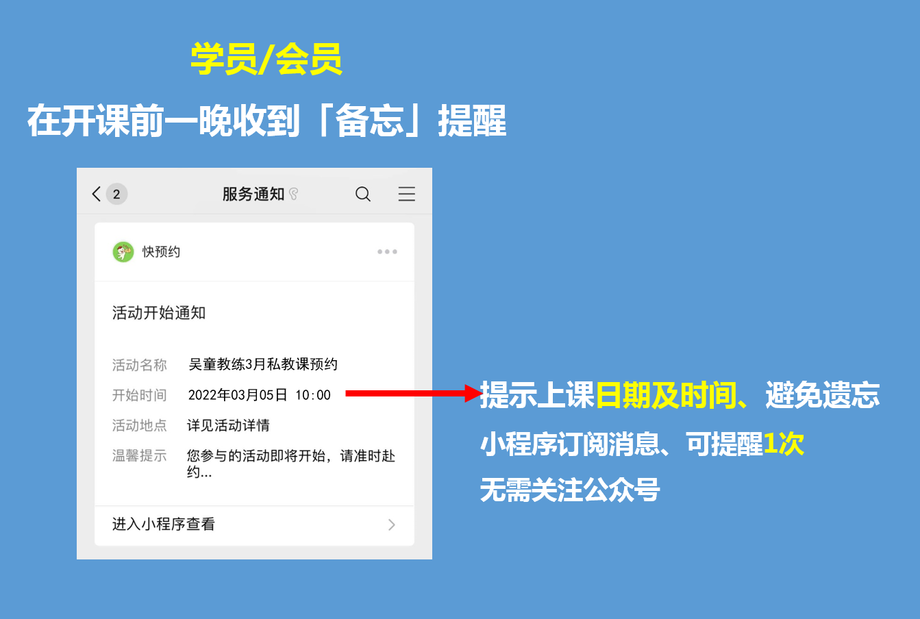 ③ 学员在课程开始前一晚上,会收到【备忘提醒】,避免遗忘: