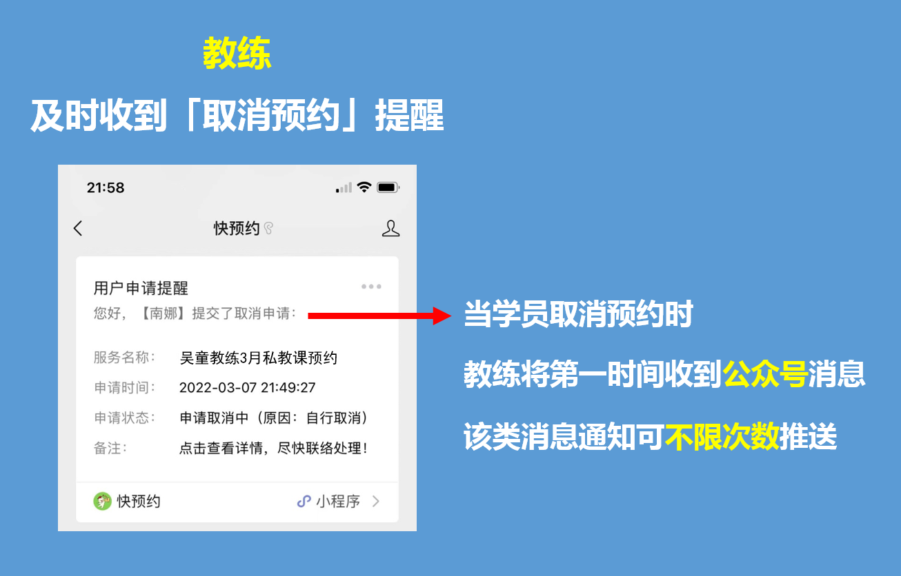 ④ 如果有学员需要临时取消预约,那么在其完成取消操作后,教练也将第一时间通过公众号收到【取消预约】提醒,可及时跟进与学员了解情况并调整课程安排: