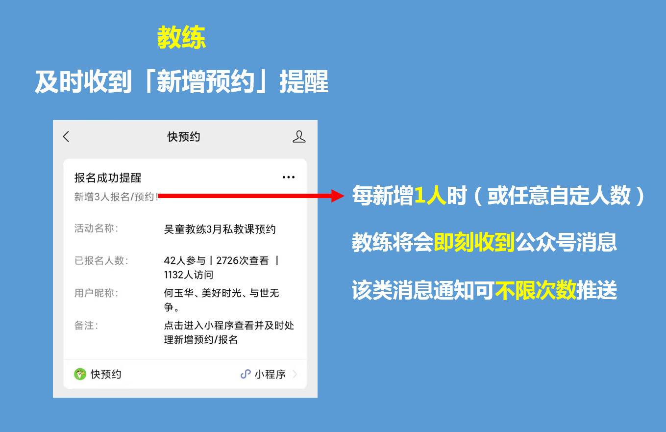 ② 学员提交预约后,教练将在第一时间通过公众号收到【新增预约】提醒,该提醒可自定义提醒的频率(如每新增1人预约或每新增5人预约时提醒一次):