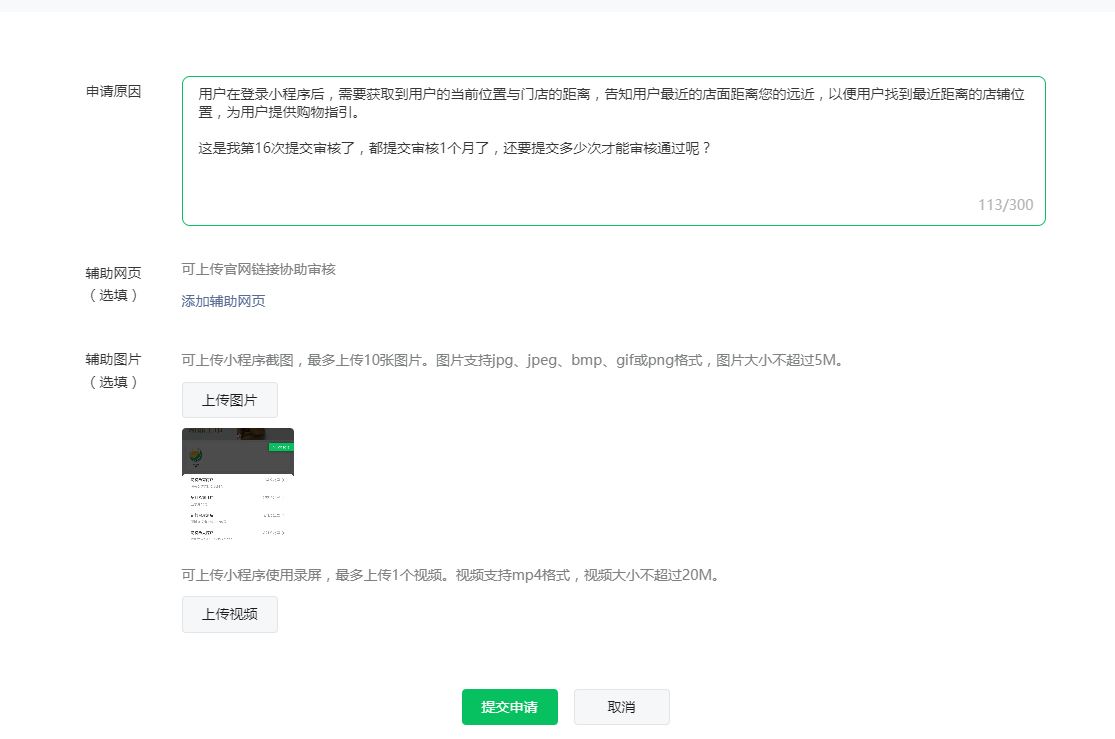 你好,核实到小程序申请wx.getLocation接口审核不通过,根据提交的申请信息可知申请该接口是用于【根据用户位置推荐最近门店以及计算距离】,不符合wx.getLocation接口使用场景开放范畴。建议使用wx.getFuzzyLocation、wx.chooseLocation或wx.choosePoi、wx.chooseAddress接口实现上述场景。若含有线下门店导航服务,可以支持wx.getLocation接口,建议提供小程序内线下门店导航相关截图或录屏重新提交。可参考相关案例解析:https://developers.weixin.qq.com/community/develop/doc/000646718d40a08a65ed1e2175bc09