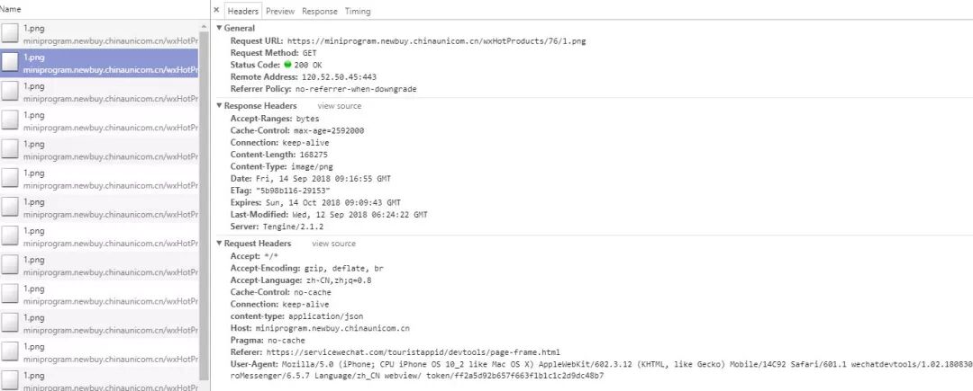 用wx.request请求一个网络图片,比如https://miniprogram.newbuy.chinaunicom.cn/wxHotProducts/76/1.png,并不支持http缓存协议,请求头中没有缓存字段,如下图