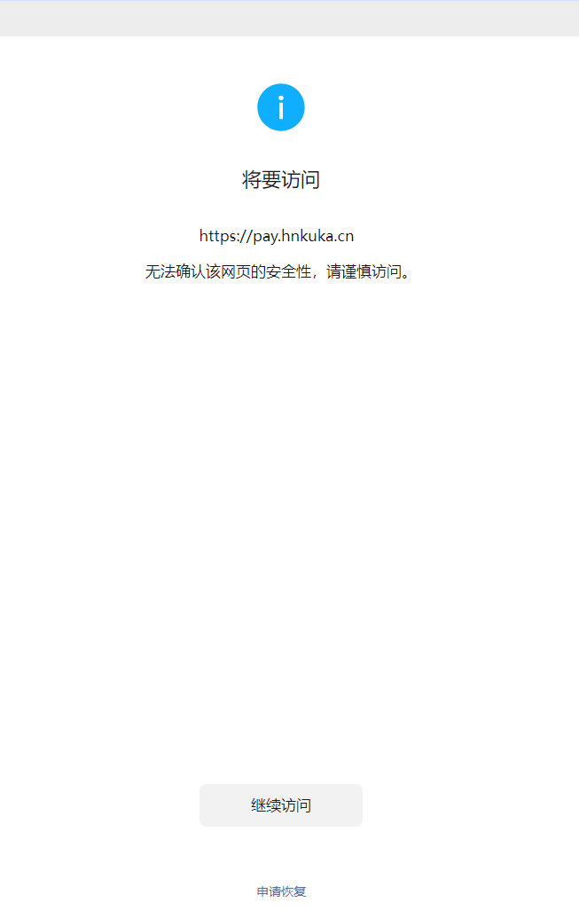 您好,域名https://pay.hnkuka.cn在华为云注册并备案通过,浏览器访问正常,我是网站开发者,访问时间如图2025/07/23,微信访问出现“无法确认该网页的安全性,请谨慎访问”,经检查网页没有安全风险,请核实后帮忙解除拦截,谢谢!