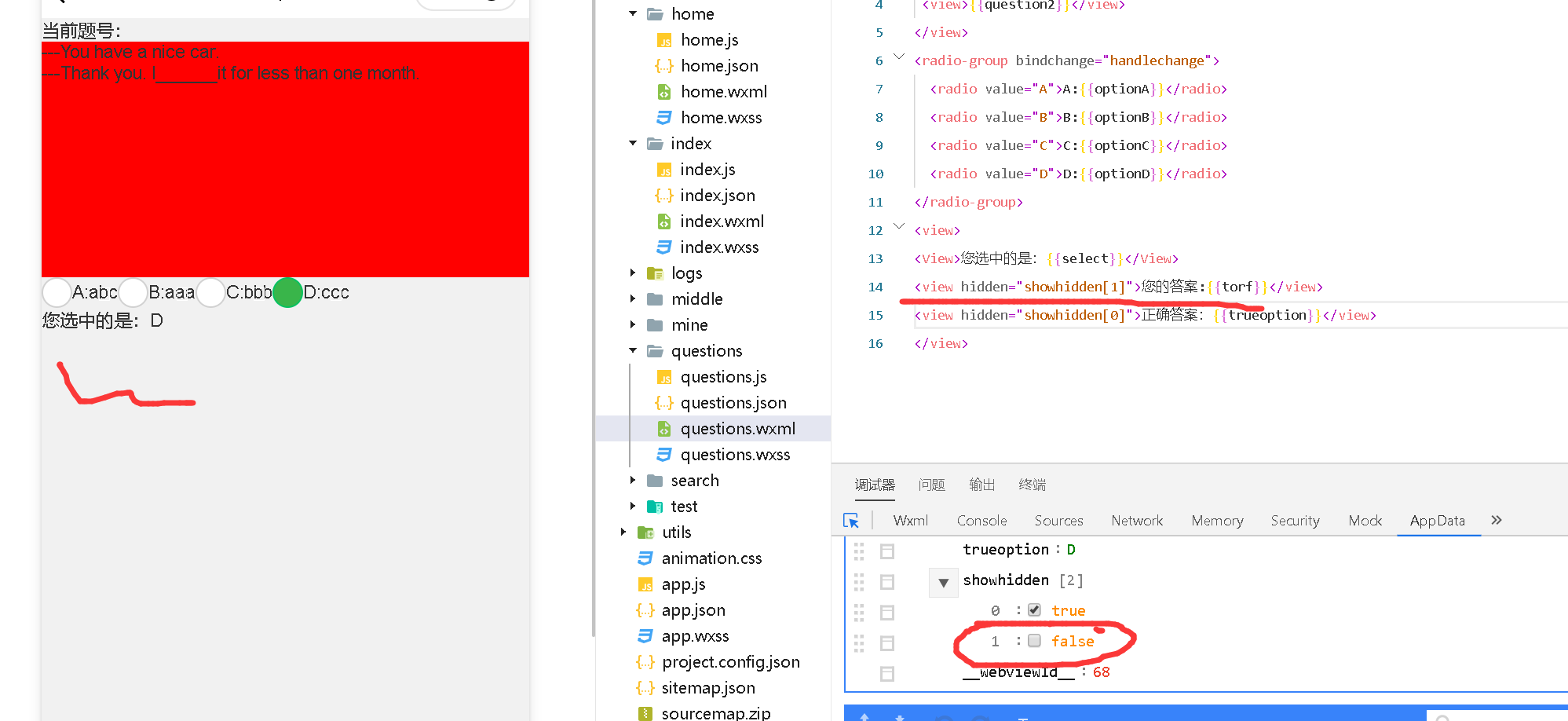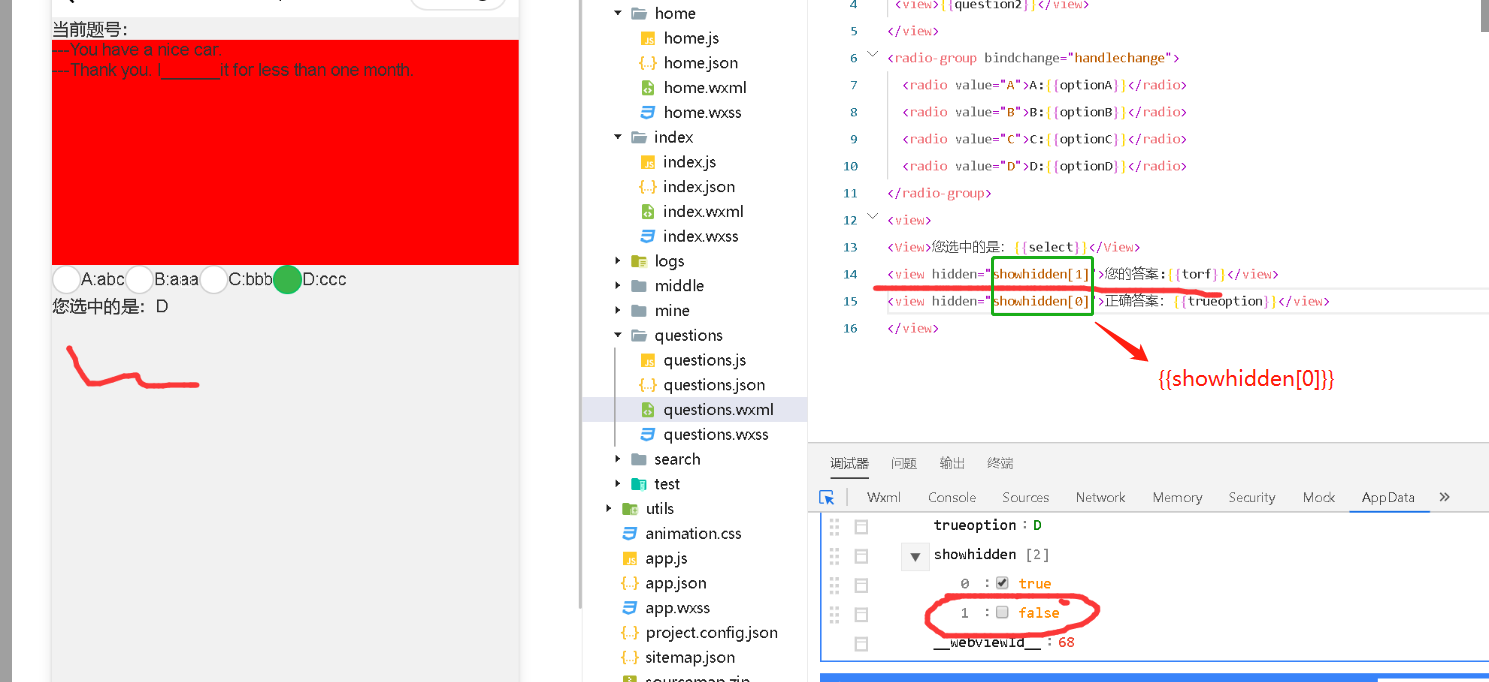 hidden="{{true}}" => 隐藏 hidden="{{false}}" => 显示 hidden="showhidden[0]" 等价于 hidden="{{true}}" => 隐藏