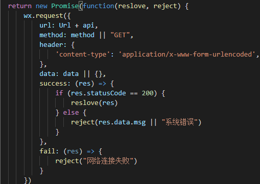 /* 封装的 wx.request 请求 请求路径域名前缀 host 从 app.js 里面获取 data 转 JSON字符串 根据实际情况处理 请求头 header 从 app.js 里面获取 可根据实际使用情况在此处配置请求的加解密 */ const app = getApp() const request = (url, options) => { var header = app.header; return new Promise((resolve, reject) => { wx.showLoading({ title: options.loadingText||"加载中", mask: options.loadingMask||false }) wx.request({ url: `${app.host}${url}`, method: options.method, data: options.data, header: header, success(request) { wx.hideLoading(); /* 根据返回状态码判断返回数据 */ if (request.statusCode === 200) { if (request.data.code === 1&&!options.hideModal) { wx.showModal({ title: "警告", content: request.data.msg, showCancel: false }) } resolve(request.data); } else if (request.statusCode === 401) { wx.showModal({ title: "警告", content: "XXXXXXXXXXXXXXX!", showCancel: false, success(){ wx.clearStorage(); wx.reLaunch({ url: "/pages/login/login" }) } }) } else if (request.statusCode === 429) { wx.showToast({ title: "请求过于频繁!请不要多次重复刷新页面!", icon: "none" }) } else { reject(request.data) } }, fail(error) { wx.hideLoading(); reject(error.data) } }) }) } const get = (url, options = {}) => { return request(url, { method: 'GET', data: options.data, loadingText: options.loadingText, loadingMask: options.loadingMask, hideModal: options.hideModal }) } const post = (url, options) => { return request(url, { method: 'POST', data: options.data, loadingText: options.loadingText, loadingMask: options.loadingMask, hideModal: options.hideModal }) } const put = (url, options) => { return request(url, { method: 'PUT', data: options.data, loadingText: options.loadingText, loadingMask: options.loadingMask, hideModal: options.hideModal }) } // 不能声明DELETE(关键字) const remove = (url, options) => { return request(url, { method: 'DELETE', data: options.data, loadingText: options.loadingText, loadingMask: options.loadingMask, hideModal: options.hideModal }) } module.exports = { get, post, put, remove } /* Demo options: { loadingText: 请求loading界面显示的文字,默认‘加载中’ loadingMask: 请求遮罩,默认‘false’不遮罩 hideModal: 隐藏code为1时的modal弹框,默认‘false’不隐藏 } import request from '../../utils/request' request.post('login', { data: {}, loadingText: "请求中" }).then(res => { if () {} }).catch(err => { wx.showToast({ title: err.message, icon: 'none' }) }) */我用fly 接口封装的 可以请求拦截