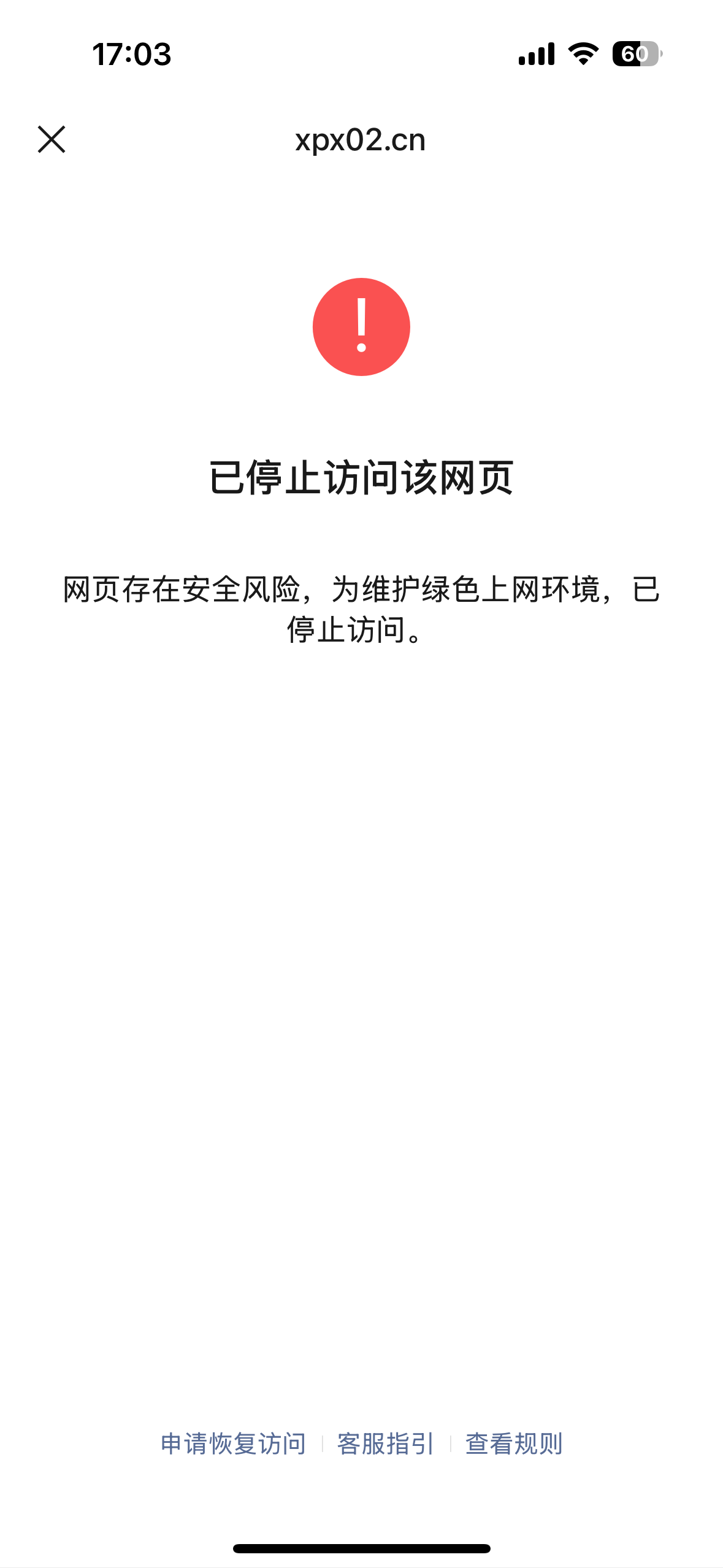 域名已备案,业务合规,微信打开网页提示 “网页存在安全风险,为维护绿色上网环境,已停止访问”,不合规的页面已经下掉了,谢谢。