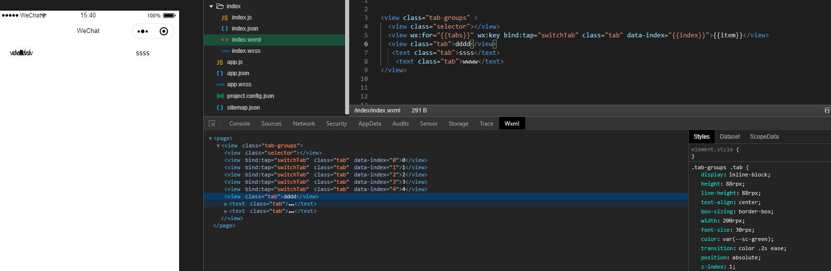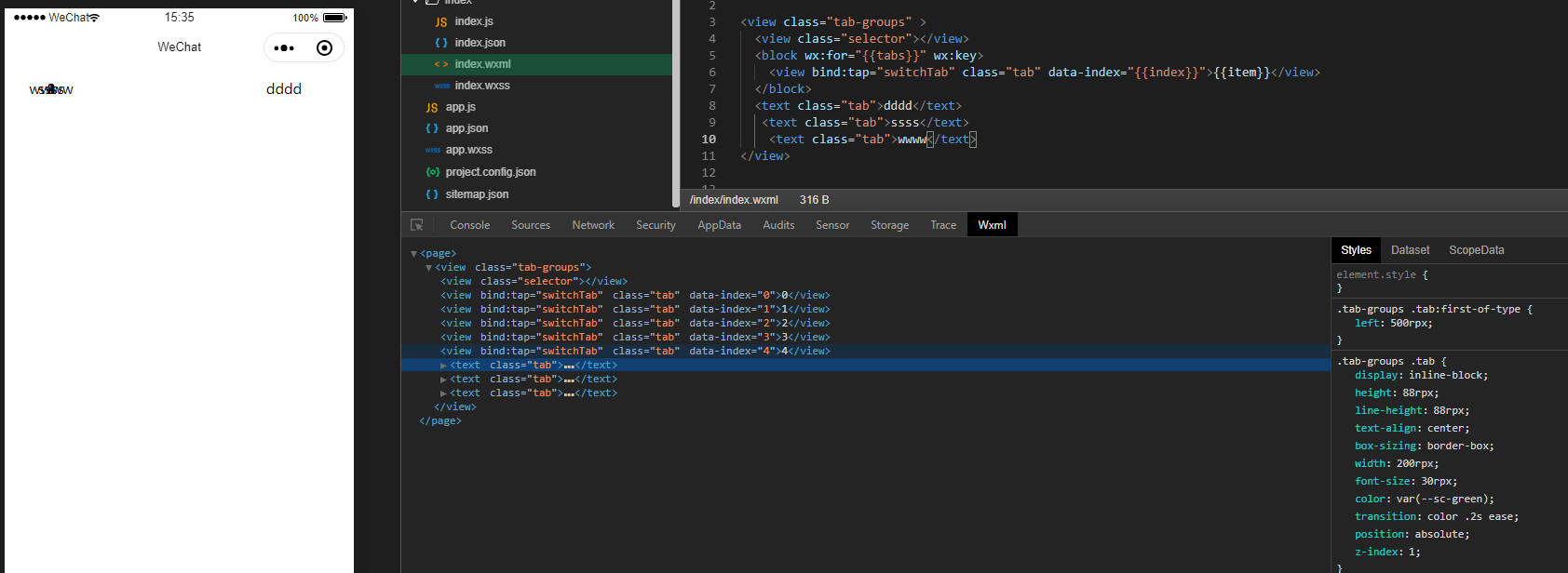 <view class="tab-groups"> <view class="selector"></view> <block wx:for="{{tabs}}"> <view bind:tap="switchTab" class="tab" data-index="{{index}}">{{item}}</view> </block></view> |