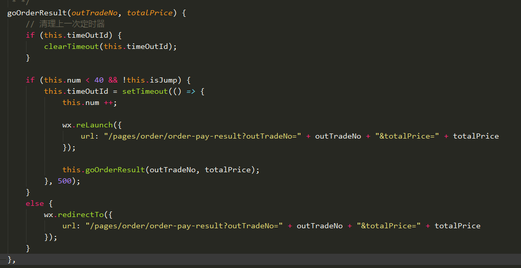 写个定时器,监听回调,不知是否是蠢办法,但是解决了问题,20秒或设置更长的等待时间。num为调用次数,isJump标记是否已经跳转,在onUnload页面销毁时,标记为true,并清理定时器