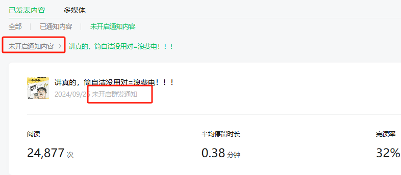 未开启群发通知的文章,推送数据统计从哪个接口获取,正常群发数据是从/getarticletotal这个接口获取的,但是我在这个接口中,没有看到群发通知的文章数据及标题