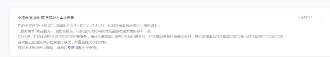 你好,经核实,贵方小程序最新提审版本仍涉及提供专利代理服务,需补充选择商业服务-专利代理类目(详图如下)
