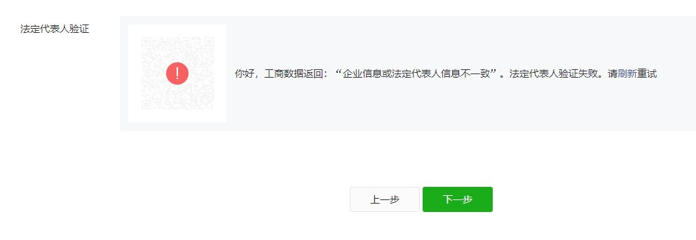 我这边已经把小程序注册好了,正要微信认证,在扫码时,出现“企业信息或法定代表人信息不一致”。法定代表人验证失败”,这个是怎么回事?