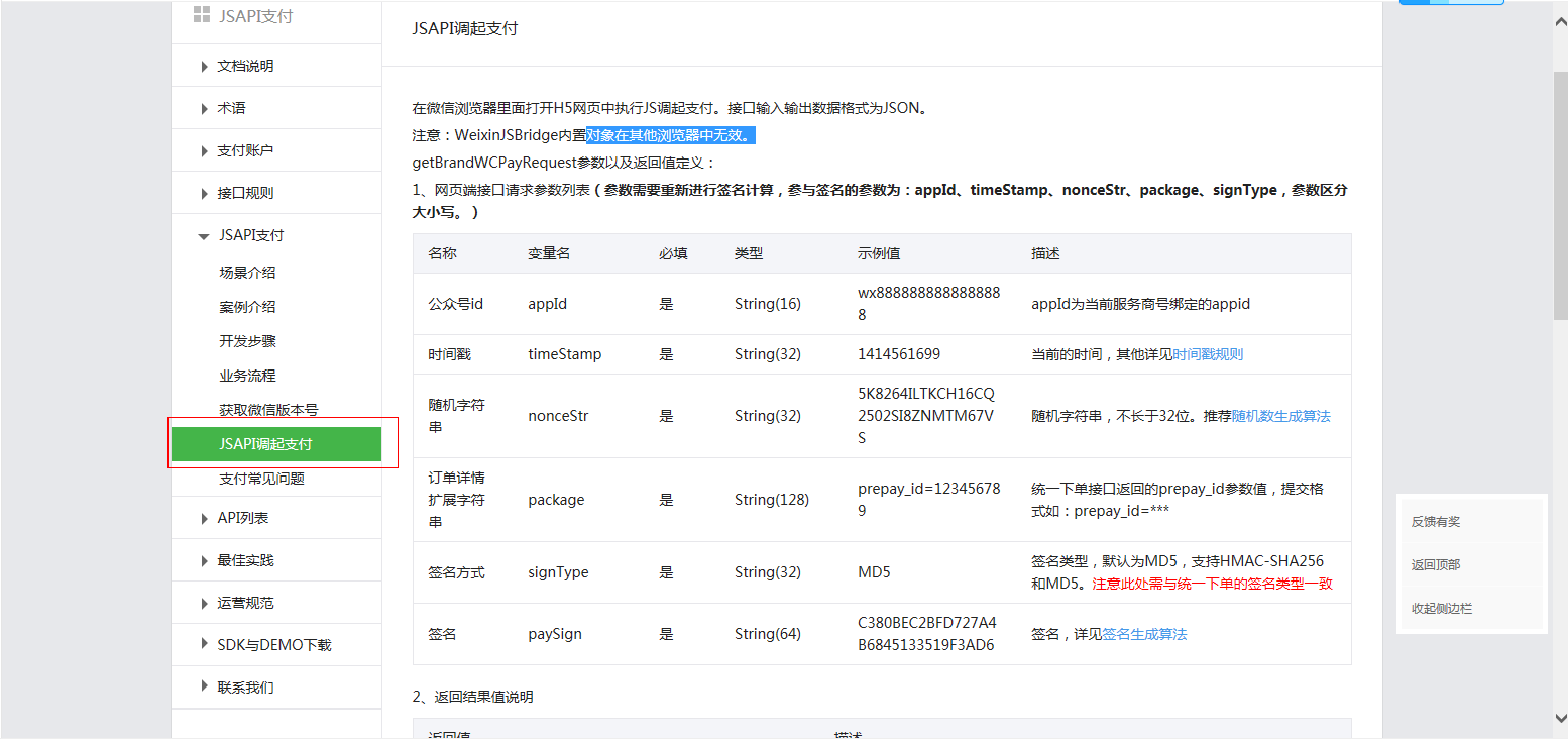 appIdtimeStampnonceStrpackagesignType//二次签名得到的 签名字符串paySignjs----------- 公众号的 小程序也差不多把接口返回的数据放如下所示WeixinJSBridge.invoke( 'getBrandWCPayRequest', { "appId": appId, "timeStamp": timeStamp, "nonceStr": nonceStr, "package":package, "signType":signType, "paySign":paySign }, function (res) { console.log("支付回调数据", res) // 使用以上方式判断前端返回,微信团队郑重提示: //res.err_msg将在用户支付成功后返回ok,但并不保证它绝对可靠。 if (res.err_msg == "get_brand_wcpay_request:ok") { //支付成功 } else { //支付失败 } });