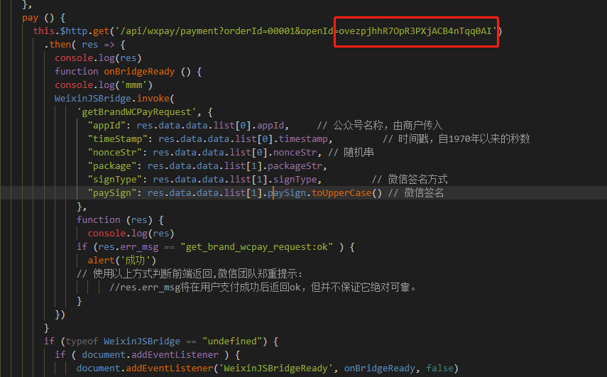 WeixinJSBridge.invoke( 'getBrandWCPayRequest', { "appId": appId, "timeStamp": timeStamp, "nonceStr": nonceStr, "package":package, "signType":signType, "paySign":paySign }, function (res) { console.log("支付回调数据", res) // 使用以上方式判断前端返回,微信团队郑重提示: //res.err_msg将在用户支付成功后返回ok,但并不保证它绝对可靠。 if (res.err_msg == "get_brand_wcpay_request:ok") {