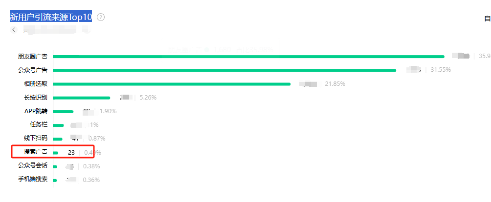 各位大神帮忙看下,我在we分析里面。新用户引流top10中统计数据都是根据场景来统计,每个统计项移上去都能看到具体来源,唯独这个搜索广告,不知道从哪来的数据,参考场景说明列表也找不到对应的值。这个数据到底是从哪里来的呢?大神们帮忙看下。谢谢