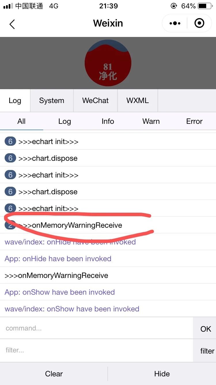 模拟下拉刷新列表,每3秒定时重新加载列表输出图表,普通echarts图表和水波图都会出现内存超出提示,继续操作下去,就会提示内存不足,或者闪退。