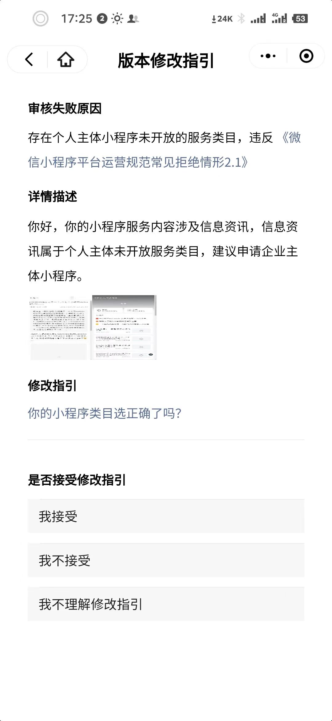 3、关于反馈其他小程序存在类目不符的情况,会进一步核实处理;用户也可在对应小程序内提交截图信息进行举报投诉,会有相关负责同学进行核实处理,如果核实确实存在违规情况,会作出相应处罚的。