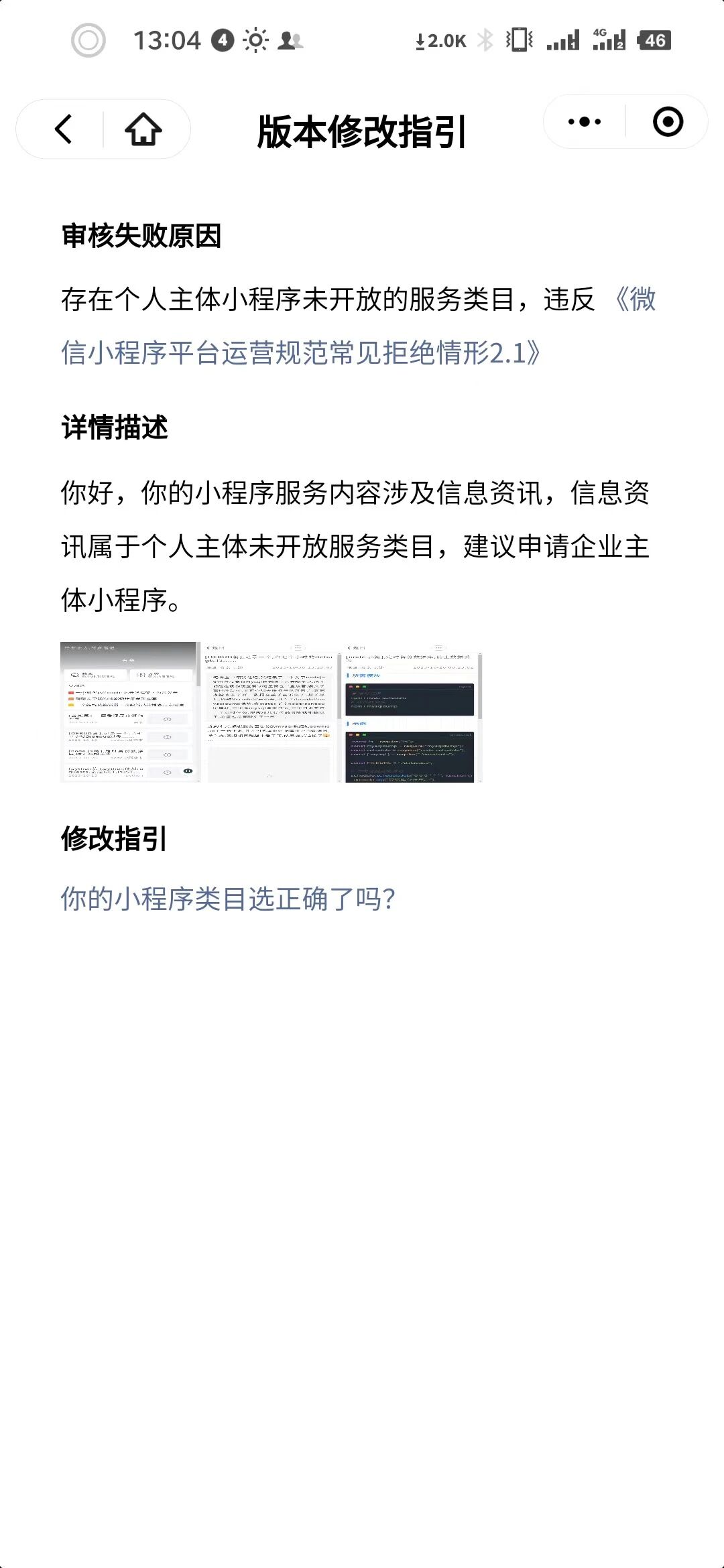2、原创文章涉及科技教育资讯信息,信息资讯属于个人主体未开放服务类目,建议重新定位小程序功能服务