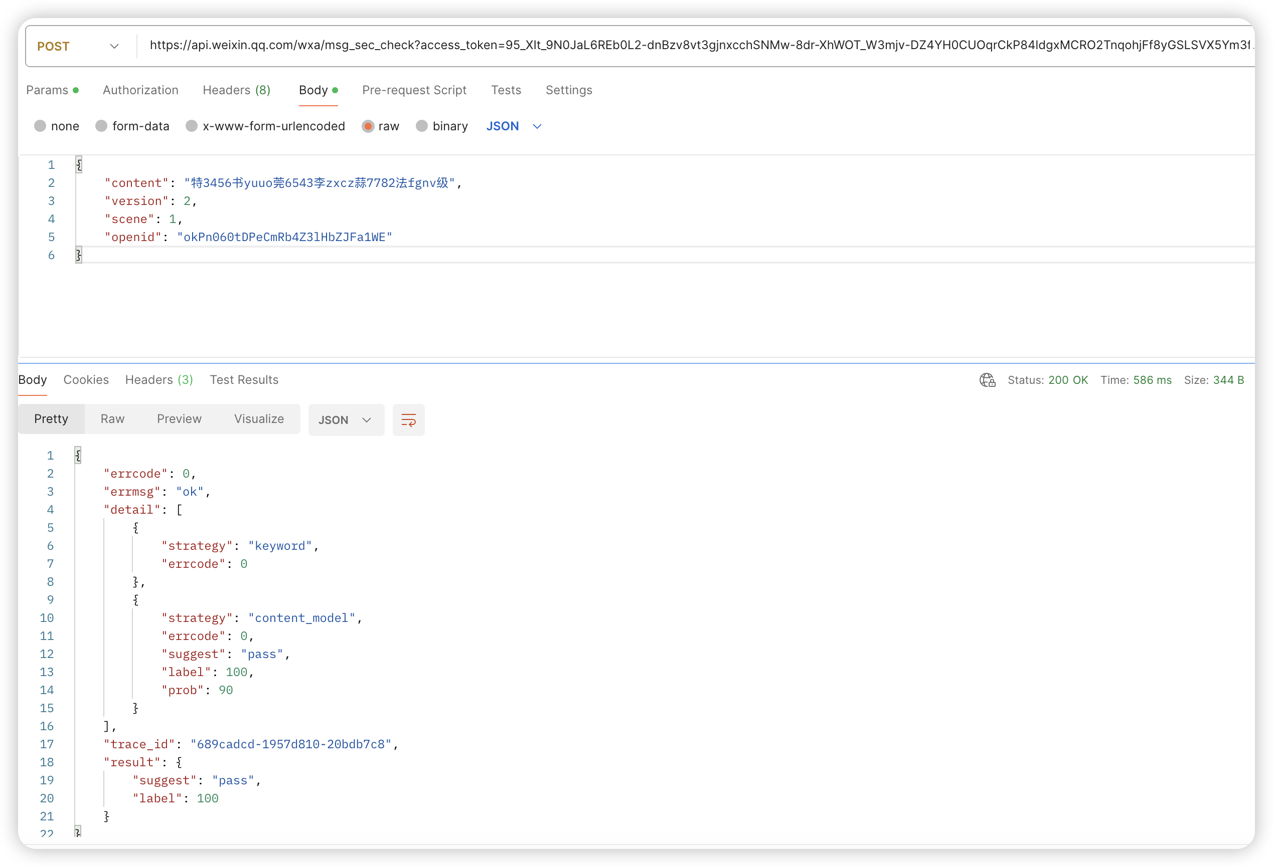我传入的content是违规内容,但是返回内容result. suggest = pass ,一直是pass,这是为什么?