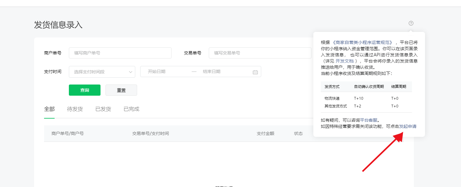 你好,根据平台规则,提供实物商品在线销售及配送相关服务(包括但不限于物流快递、同城配送等方式)的小程序,均需接入平台订单发货管理功能,详情可了解:https://developers.weixin.qq.com/miniprogram/product/jiaoyilei/yunyingguifan.html#_1-5-%E8%B5%84%E9%87%91%E7%BB%93%E7%AE%97,如有特需经营要求需关闭该功能,可在发货信息管理页发起申请,申请通过后可关闭。