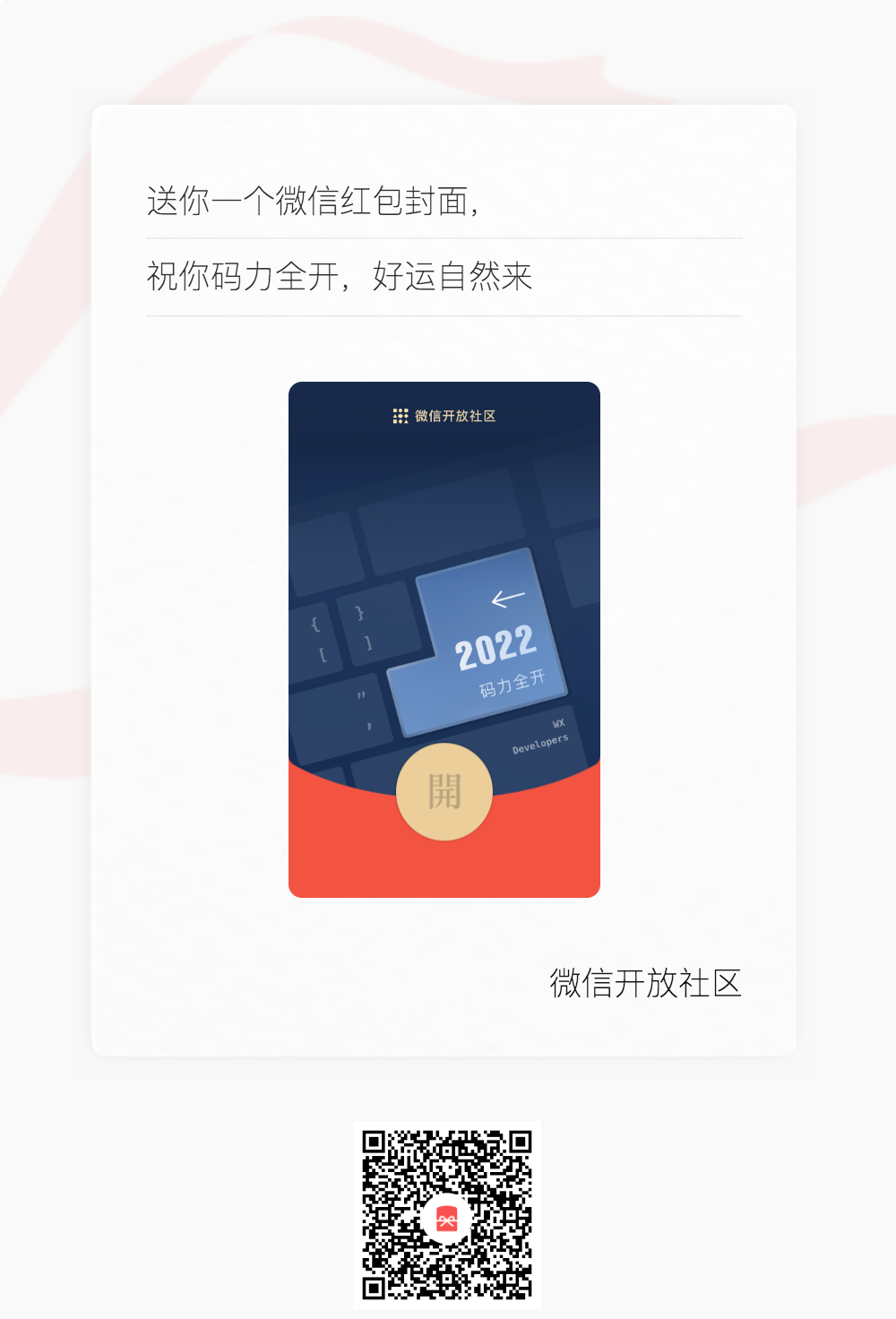 微信开放社区首批「2022 码力全开」红包封面 现正放送,后续还有多轮红包封面分享,敬请期待!