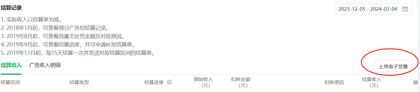你好,请先检查下对应结算区间的结算进度状态,待流转为“已结算”状态意味着结算单已下发,此时可选择对应的结算单据上传电子发票。