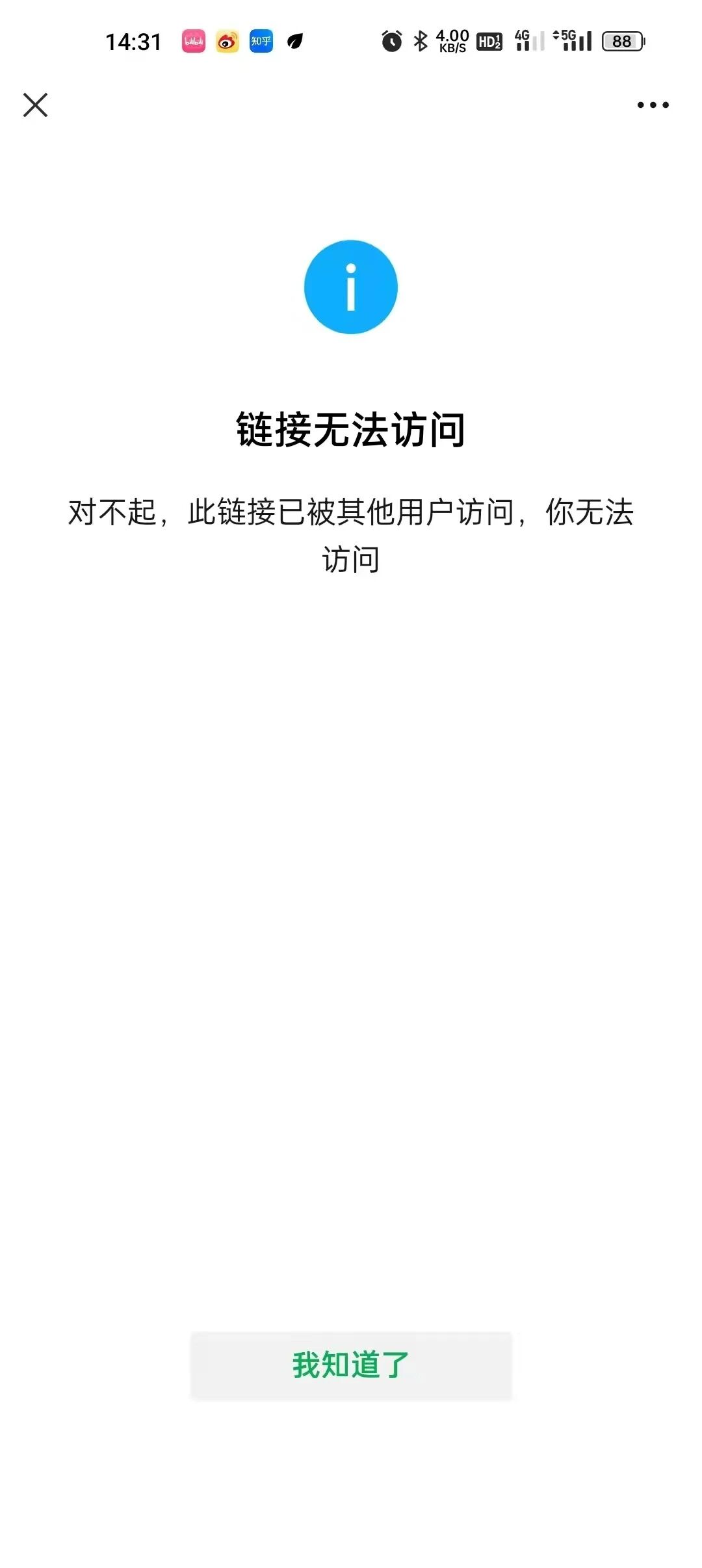 从钉钉点击链接跳转打开微信小程序,微信这边提示“对不起,此链接已被其他用户访问,你无法访问”?