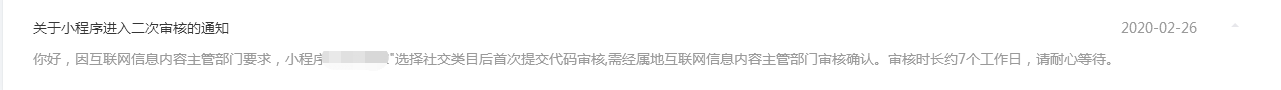 你好,小程序涉及首次提交社交类目,进入报备流程,由网信办二次审核,如遇紧急上线等特殊情况,建议开发者自行联系省/自治区/直辖市属地网信部门,报备详情请参考:https://developers.weixin.qq.com/community/operate/doc/00002a6a0b8d98a965993666a51001