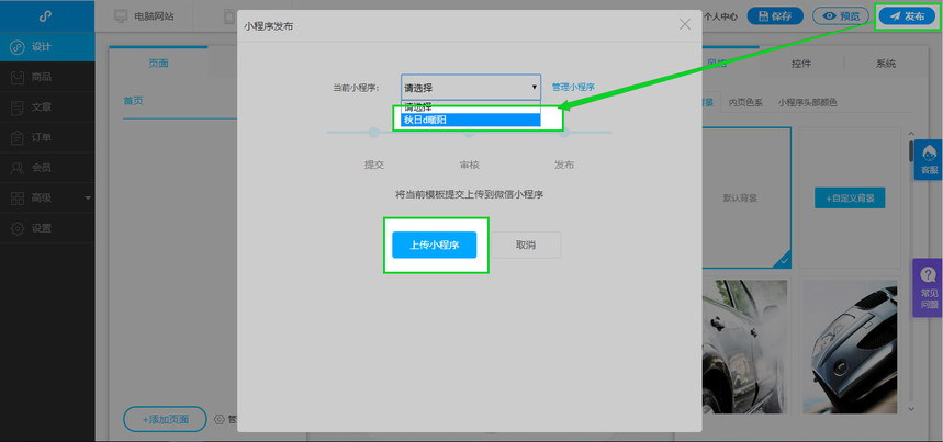 2、在弹出的页面,选择已授权的小程序账号,并点击上传小程序,进行上传,,如图21、图22。