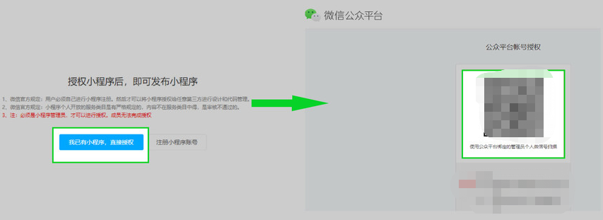 2、 点击“我已有小程序,直接授权”,使用小程序管理员的微信扫描弹出的二维码进行授权。如图14。