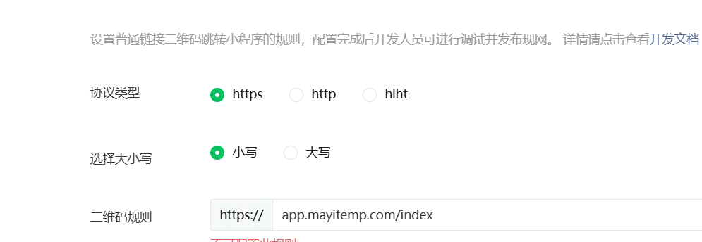 你好,建议重点检查:1.二维码规则对应的域名是否已通过ICP备案验证 2.使用的协议类型是否符合要求(https、http或hlht)3.规则数量是否在100个以内。4.在微信打开确认域名链接是否存在违规提示。若一切正常,可重新配置并发布。参考文档:介绍/扫码打开小程序接入指南