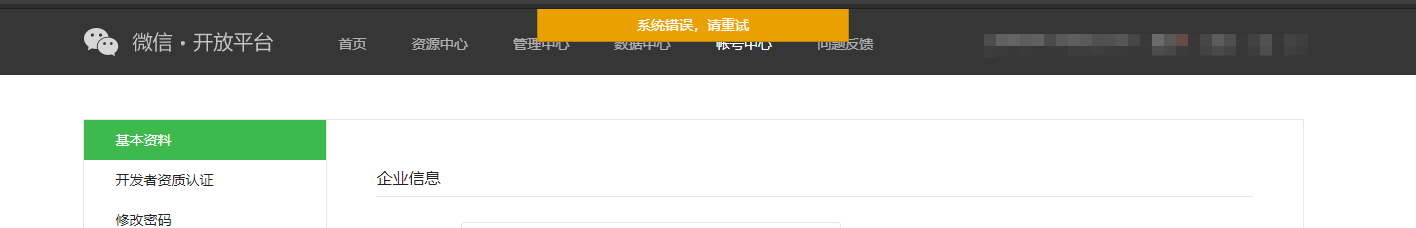 开放平台完善基础资料时,一直提示"系统发生错误 轻稍后重试"??