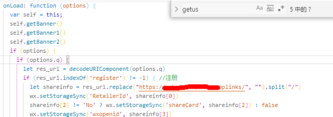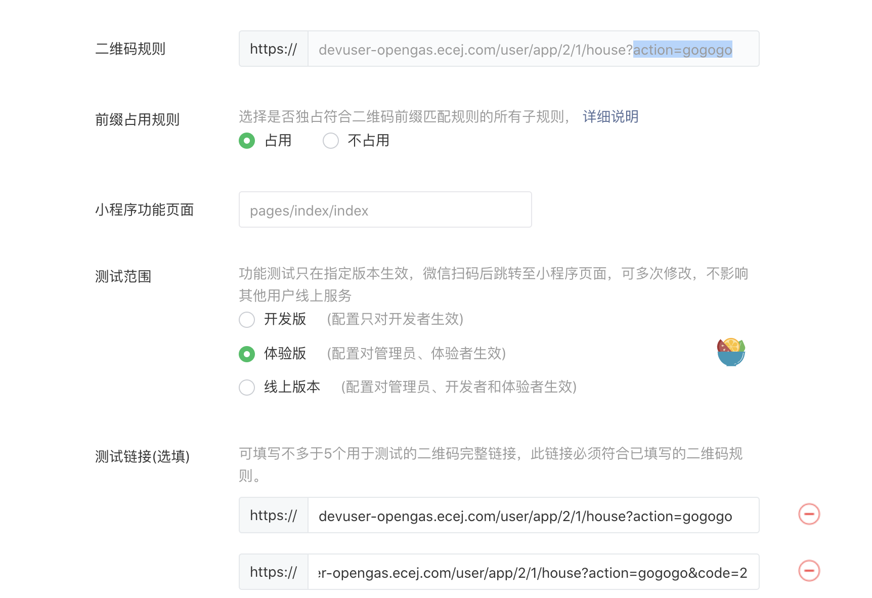 这里只是填写二维码的规则,后面的就不要了,这里传参以 / 分割,比如devuser-opengas.ecej.com/user/app/2/1/house/gogogo/3 ,你们自己规定好,比如第一个就是action参数,第二个就是code参数, 然后生成二维码之后,小程序扫码,结果在二维码规则指定页面的onload里面,用这个来进行接收-》 decodeURIComponent(options.q) ,返回值就是你的二维码链接,然后匹配一下是否满足你的规则,字符串方法对该链接进行操作,拿到参数。
