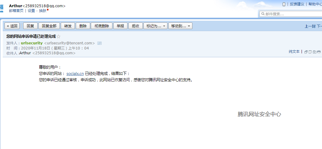 补充2: 腾讯安全中心回复的处理结果是通过审核,申诉成功,如下截图:
