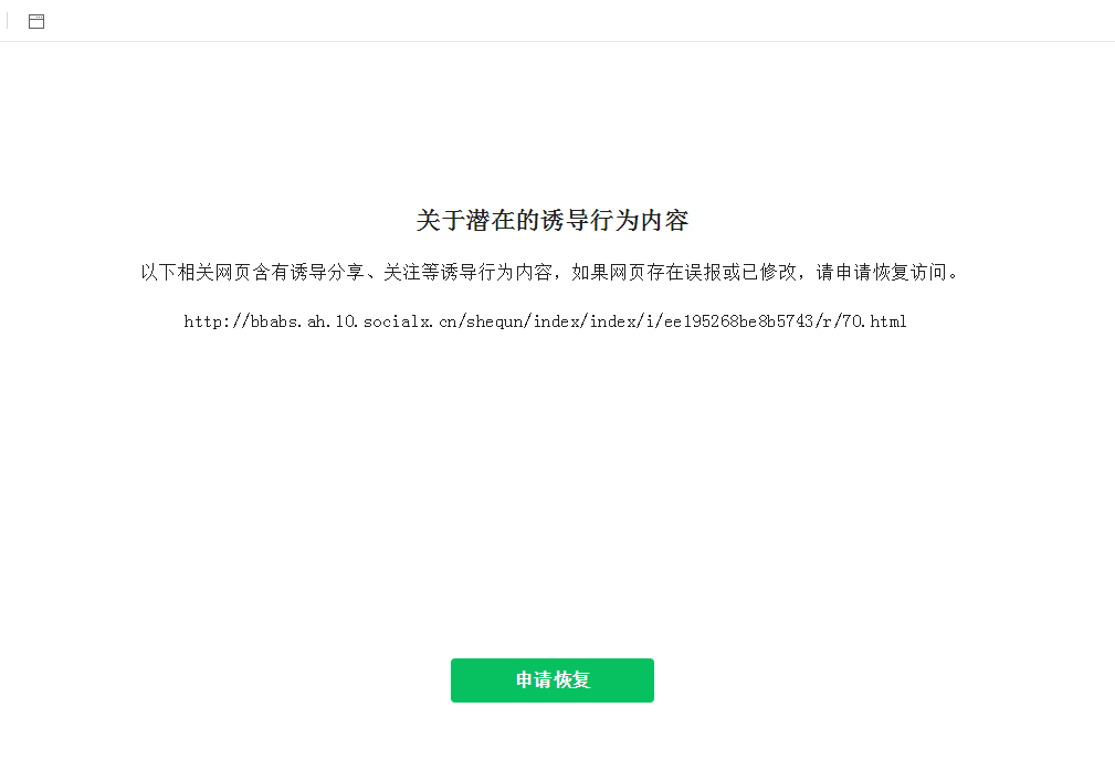 你好,经核实,域名socialx.cn下的链接【http://bbabs.ah.10.socialx.cn/shequn/index/index/i/ee195268be8b5743/r/70.html】的违规内容已经修改,现已恢复微信内直接访问的服务,请知悉。