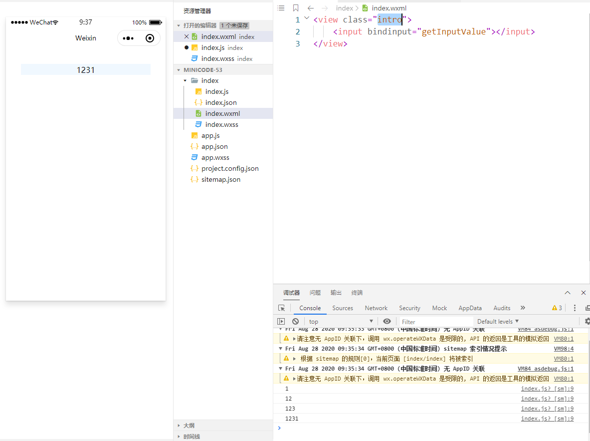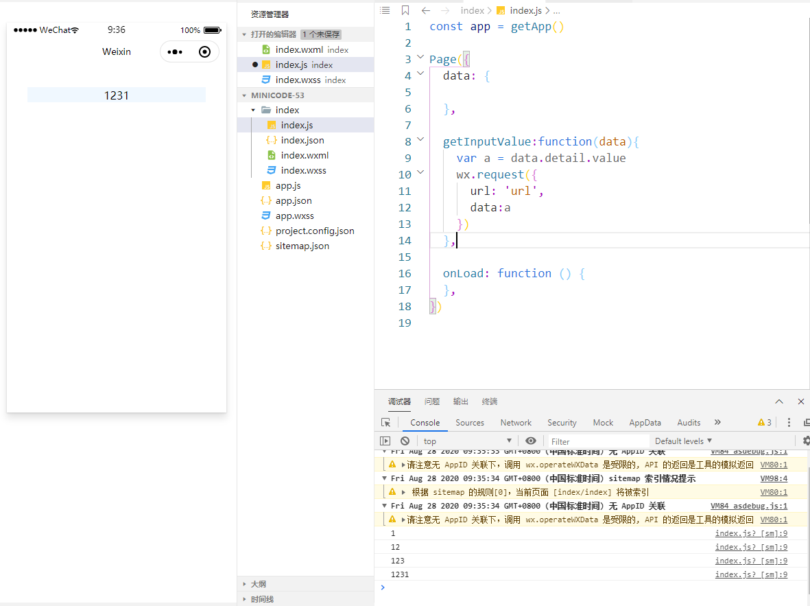 大哥们 我想写个 输入框 然后获取输入框的内容 把这个值 给wx。request 中的 Data用 求大佬给个完整的代码 我太小白了 参数传递不过来