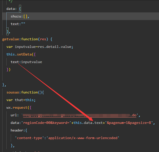 `regionCode=00&keyword=${this.data.text}&pageNum=1&pageSize=8`