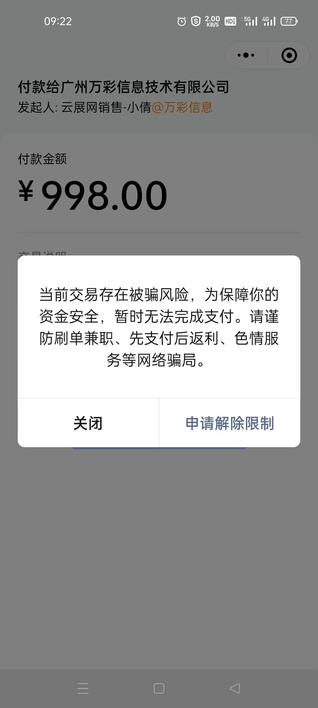 客户给我司商户号付款时出现以下提示“当前交易存在被骗风险,为保障你的资金安全,暂时无法完成支付。请谨防刷单兼职、先支付后返利、色情服务等网络骗局。”