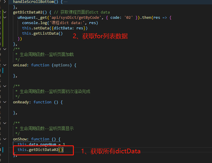 2、目前解决办法是使用wxs, 在页面中先去调用dict request 得到所有的字典表数据, this.setData设置到data里 , 然后引用wxs for数据下面上图说明,