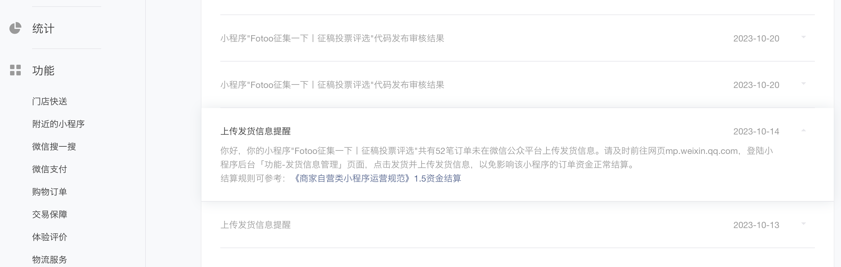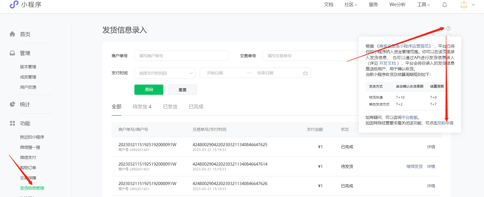 现在要求必须发货才能收到款和分账小程序管理后台截图如下