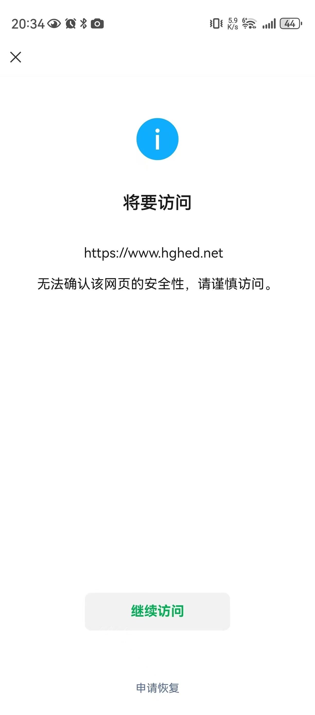 您好,域名(https://www.hghed.net/),微信访问网站出现“无法确认该网页的安全性,请谨慎访问”,经检查网页里没有不安全的内容,请核实后帮忙解除拦截,谢谢了!
