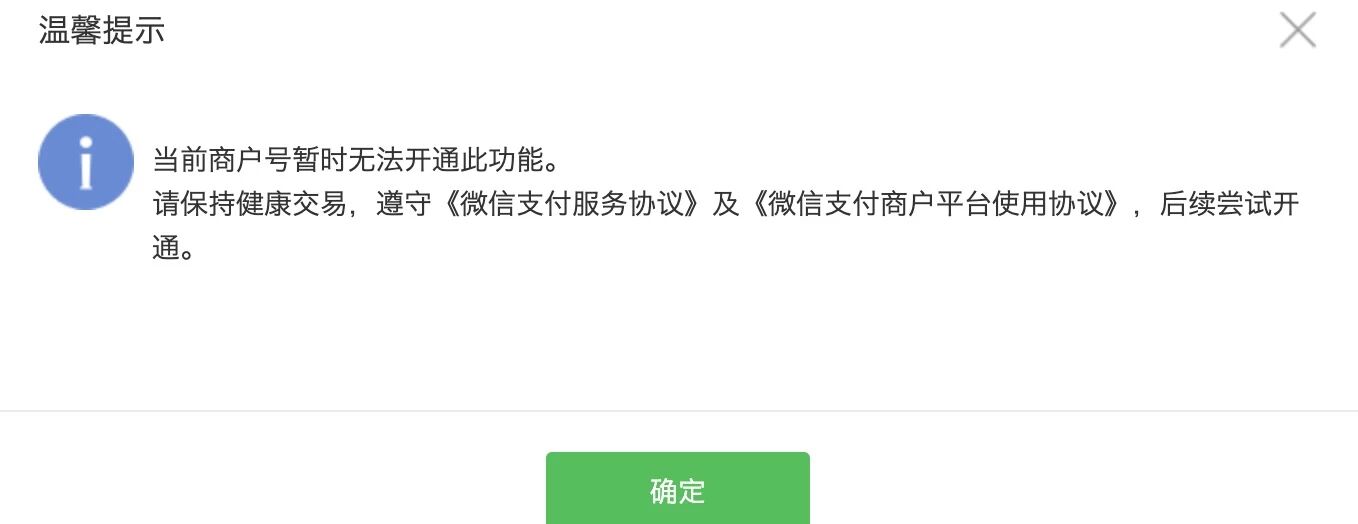 已满足入驻90天以上 及连续30天有交易(自已扫收款二维码刷的 每天2,3笔金额在3块钱左右) 开通时还是提示当前商户暂时无法开通此功能。商户号:1536975281 ,有个项目近期需要上线需要开通这个功能 还请帮忙查看一下我的这个商户号交易是否健康或是否有其他问题怎样才能开通此功能呢,麻烦了 谢谢